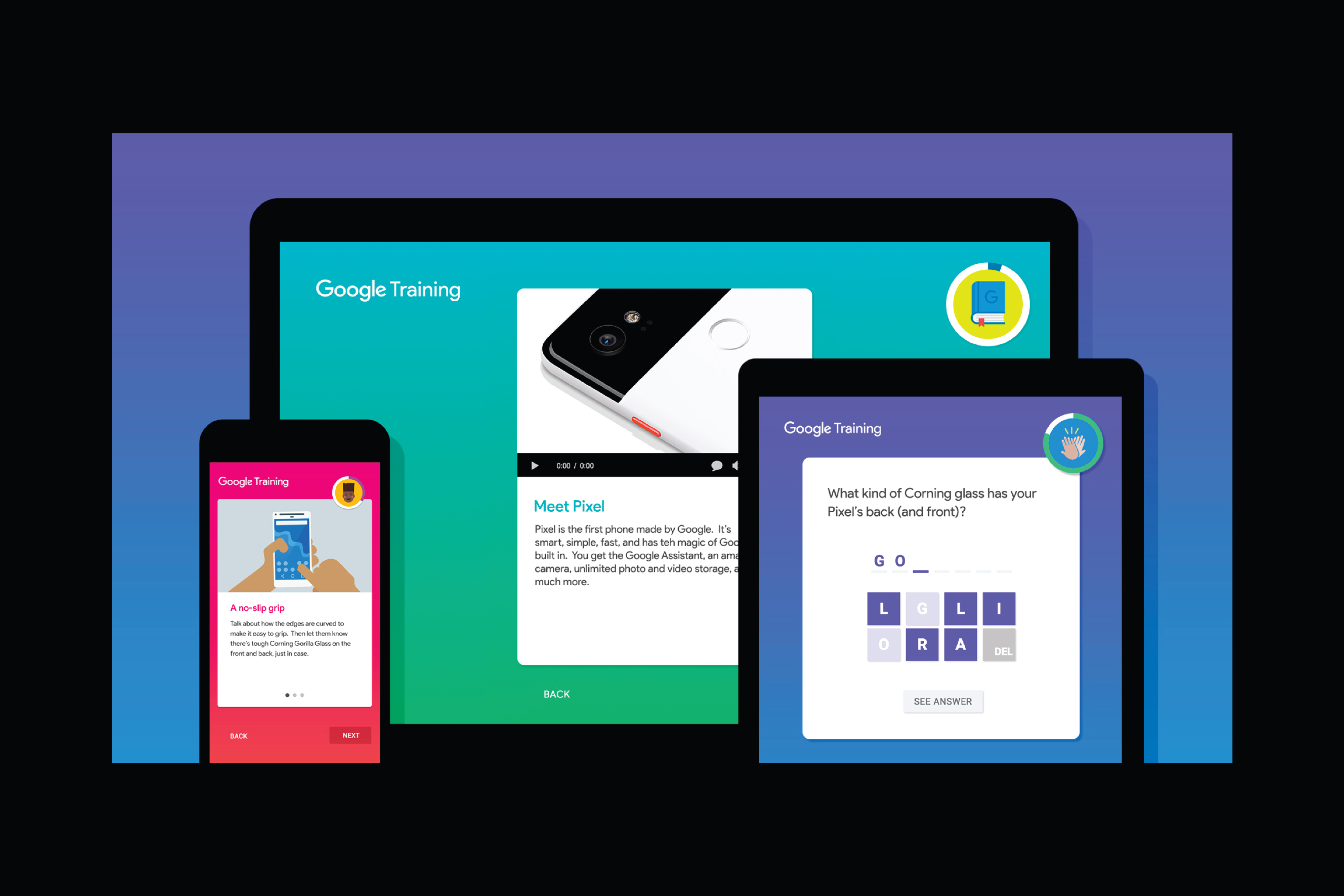 We were tasked by Google to redesign their Training app experience. Sales associates do not have much time to learn about Google products and services while on the job, and are not incentivized to do so.